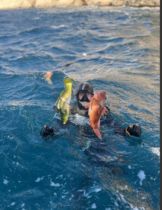 Une semaine de repérage qui commence mal avec du vent annoncé tous les jours. Forcément, après deux jours de tempête, la zone de repli au nord, à une heure de route, sera validée. Après une belle semaine de repérage avec une équipe d’amis génialissime, j’ai sur mon parcours trois mérous valables, deux grosses pierres à corb, le quota de sars quasi assuré, de beaux chapons valables et une belle frayère à loups trouvée lors de la dernière apnée du dernier jour de repérage, avec une belle femelle de 2,5 kg voire plus… Le jour J, vu la tempête en cours, je me doute que mon parcours de repérage initial ne sera plus le même. Je laisse tomber les mérous dès le départ pour me consacrer aux sars au bord ; après six sars, deux chapons et une lasagne en trente minutes, je fonce confiant sur les mérous et les corbs et là, plus aucun poisson dans aucune pierre. Je repartirai au bord pour essayer de finir les quotas ; je ferai les dix sars mais deux non valables, c’est le jeu. Content d’avoir affronté des grands noms de la CSM qui m’ont toujours fait rêver petit par leurs récits dans Apnea, cette septième place m’a donné encore plus de motivation pour la suite ; j’espère pouvoir prendre ma revanche à l’international rapidement…